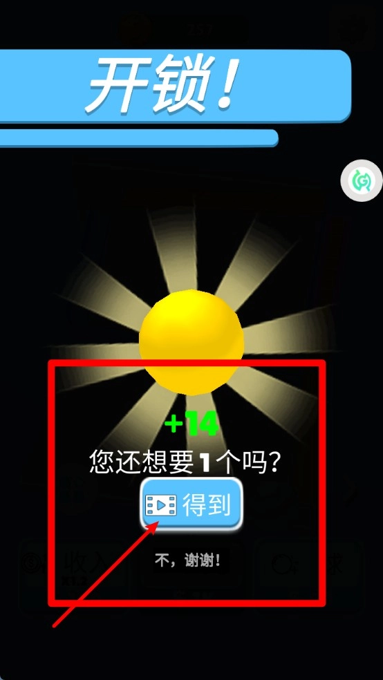 2.解锁新弹珠时,点击“得到”按钮即可直接领取奖励,玩家也可以通过观看广告来获取额外的弹珠加成。