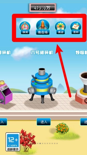 1.主菜单功能:玩家可通过菜单进入抽奖、炮击场、商店和签到页面,这些功能让你轻松获取资源,升级你的粉碎机。