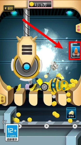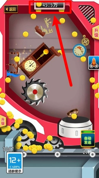 2.金币收益展示:不断粉碎物品会产生金币,金币数量实时显示在页面顶部,随时可用于强化机器性能。