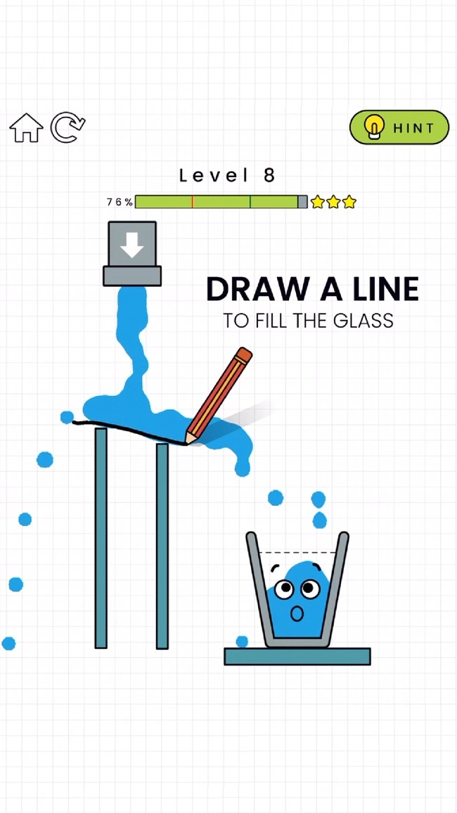 这个玻璃杯闷闷不乐,因为它空空如也。你需要画一条线,让液体注满杯子,让它重新展露笑容!