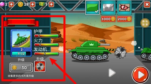 1. 进入升级界面后,可查看坦克的护甲、火力及发动机属性,合理分配资源进行强化,有助于提升整体战斗表现和生存能力。