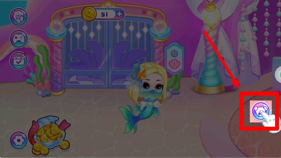 1.进入人鱼换装房间前,先点击右下角的紫色图标,开始换装流程。