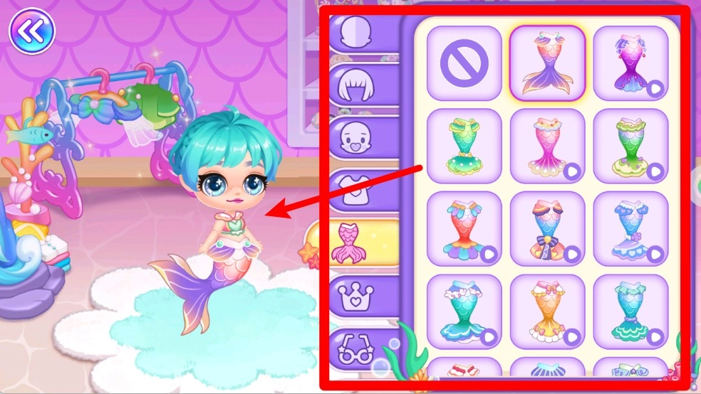 3.选择喜爱美人鱼造型在换装界面中挑选喜爱的鱼尾裙款式,自由搭配打造专属梦幻海底造型。