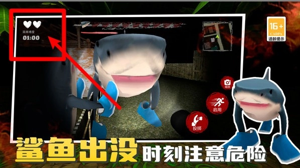 3. 左上角的心形生命值会和倒计时一同显示,当鲨鱼靠近时它会快速下降,所以一定要规划好移动路线,确保有足够时间,防止被瞬间击败。