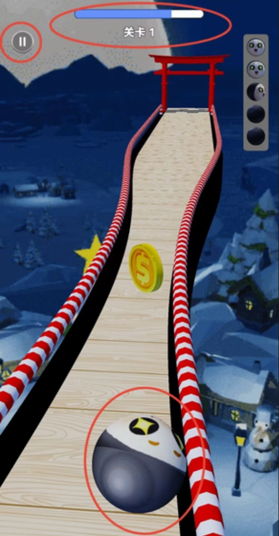 选定模式后,可通过触屏滑动操作控制球体移动,界面顶部会实时展示关卡进度,同时设有暂停功能按键。