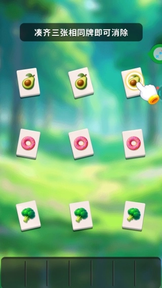 进入游戏后,点击三张相同的美食卡片来消除它们,当所有消除任务都完成时就能通关。