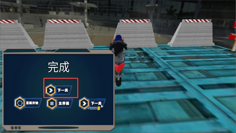 3、顺利抵达终点后立即点击屏幕中央的跳过关卡按钮,系统将自动保存当前进度并解锁后续更具挑战性的赛道。