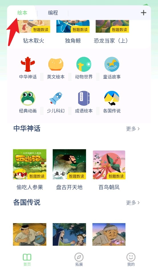 2、激活绘本页面顶部的标签后,会呈现智趣数读推荐内容以及各类绘本分类,可通过滚动操作浏览精选书目。