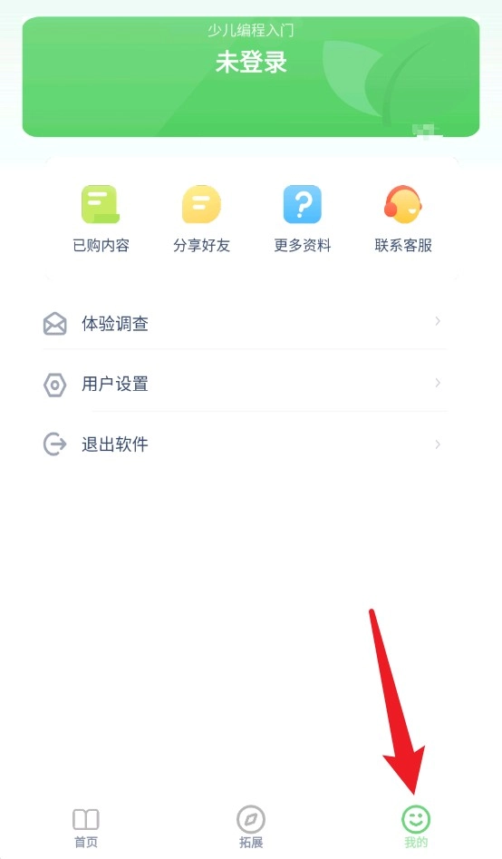 4、我的页面处于未登录状态时,顶部展示“少儿编程入门”,下方依次排列“已购”“分享”“资料”及“联系客服”功能入口,底部的“我的”导航项呈现高亮效果。