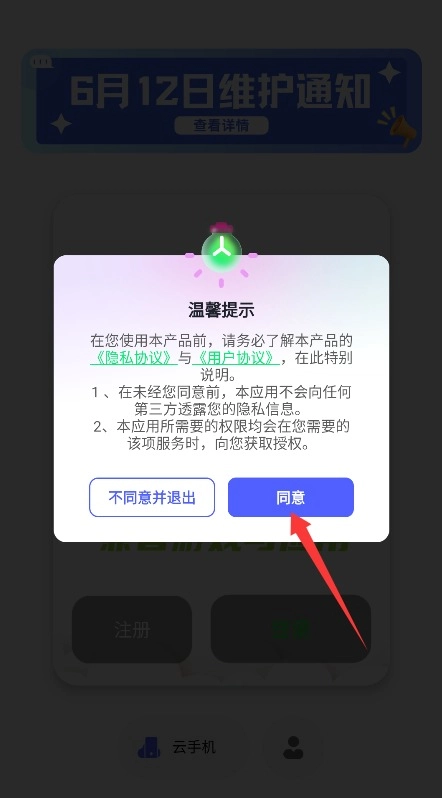 1、打开应用后,请仔细阅读服务条款和隐私政策,点击同意按钮才能进入主界面。