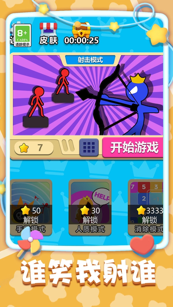 游戏里设计了完备的道具解锁系统,当你持续挑战关卡,积累经验值与金币后,便可以解锁更多强力的射箭道具。