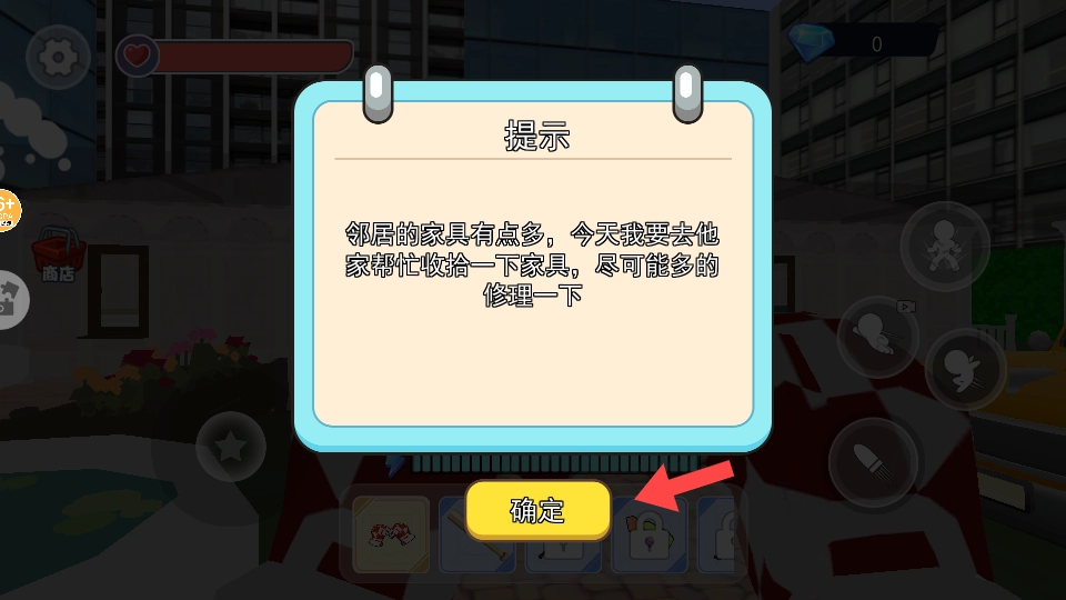 操控角色,借助屏幕下方的工具图标,对邻居家的家具开展有效的修理和整理工作。