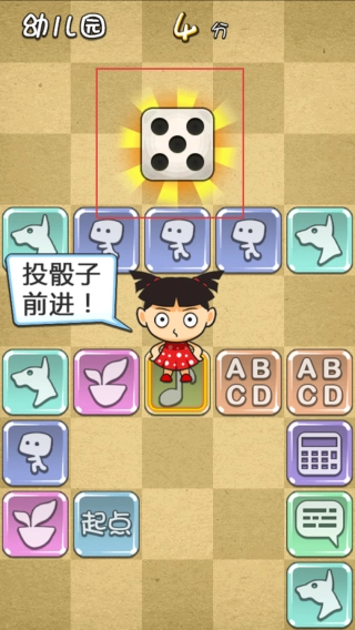 在幼儿园场景的界面里点击骰子,通过投掷骰子来前进,以此推动游戏环节的进行。