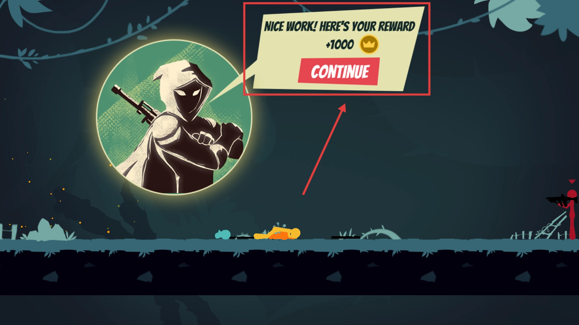 完成战斗后可获得【+1000】金币奖励,点击【CONTINUE】按钮即可继续游戏,通过积累资源能够解锁更多武器与关卡。