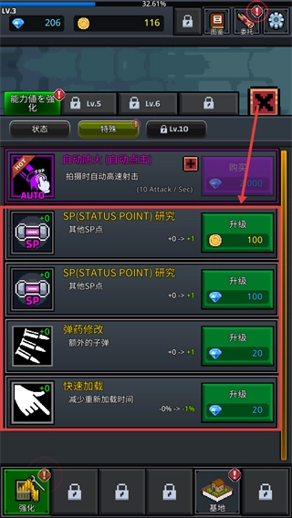 在能力强化界面,建议优先升级【SP】研究,这样能获取额外属性点,从而快速提升角色的战斗基础数值。