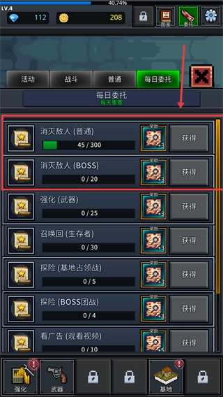 在每日委托界面里,建议优先处理消灭敌人这类任务,通过获取对应的奖励道具,来达成强化武器和提升自身战力的目的。
