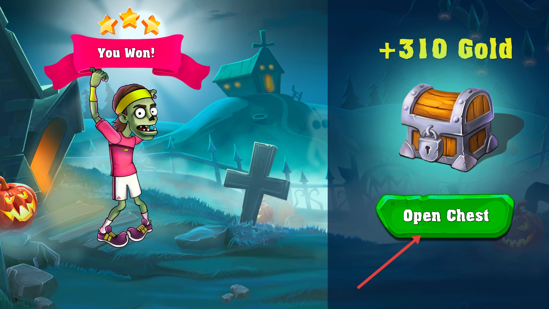 战斗获胜后,点击【OpenChest】开启宝箱,就能获得金币等奖励,为接下来的关卡挑战积累资源。