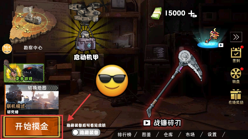 点击【开始摸金】即可开启游戏冒险之旅,您可以勾选隐藏装备选项来查看皮肤,以便为后续的探索做好准备。