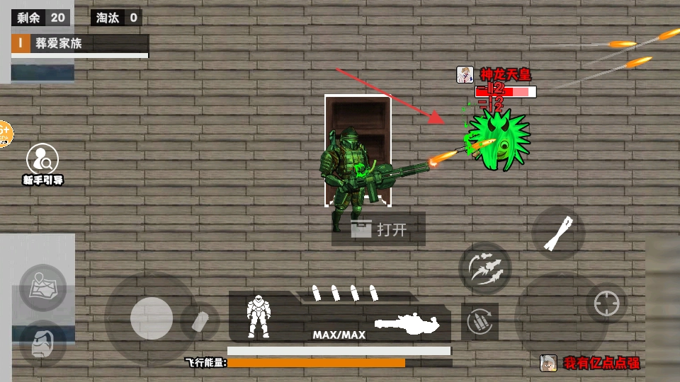 操控机甲对抗绿色怪物,留意弹药储备和飞行能量余量,成功击败怪物后就能开启物资箱收集资源。
