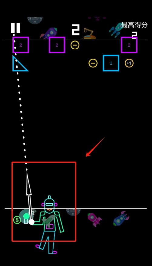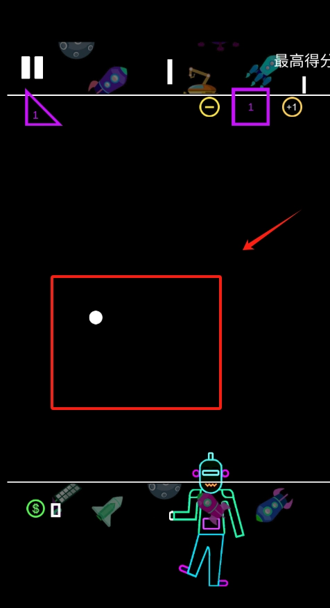 2、屏幕正中央的小白点是你的武器,通过左右滑动可以控制方向,击打砖块来获取分数。
