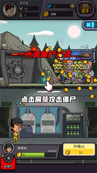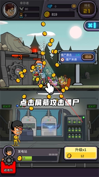 按照提示点击屏幕来攻击僵尸,点击屏幕攻击袭来的僵尸,从而获取金币。