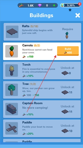进入Buildings界面后,找到Carrots对应的Build按钮并点击,消耗400资源来建造胡萝卜设施。