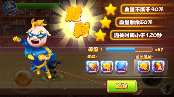 战斗获胜后,点击确认按钮,领取对应的奖励,然后就可以去挑战新的关卡了。