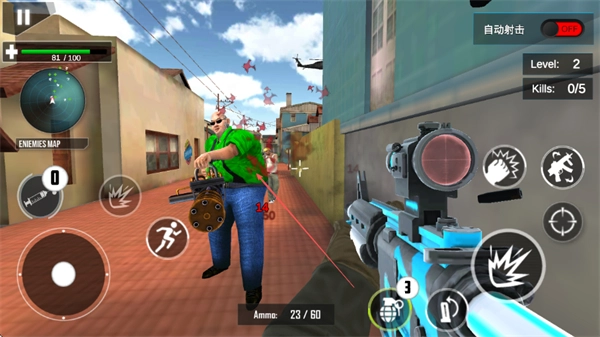 战斗时,可通过左侧的虚拟摇杆操控移动,右侧则用于瞄准与射击。面对不同类型的敌人,比如携带重武器的胖子敌人,需要精准攻击其要害部位,以实现快速消灭。