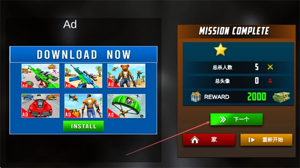 每关需要消灭指定数量的敌人,比如当总击杀数达到5时,就能完成任务(MISSIONCOMPLETE)并获得奖励,点击“下一个”即可进入下一关继续挑战。