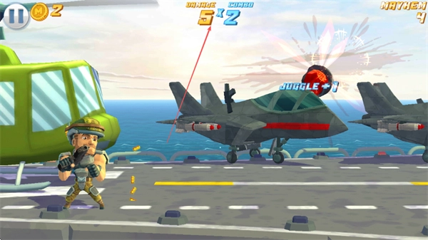 在航母的作战场景里,玩家操控角色对敌方战机进行射击,一旦命中就会引发爆炸效果,同时还能积累相应的伤害数值与金币奖励。