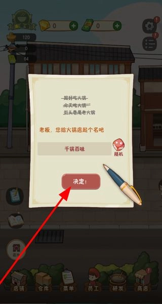 可以帮你给火锅店起名字,你输入心仪的店名后点击“决定”按钮,就能确定火锅店的名称,打造出专属于你的店铺啦。