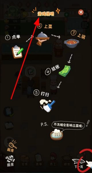 玩家能够查看游戏说明,知晓点单、上菜、上锅、结账、打扫等环节,熟悉游戏的玩法。