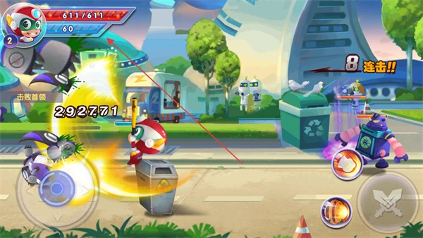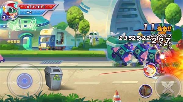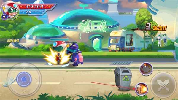请留意屏幕左上角开心超人的生命值(当前为611/611)和能量值(当前为60),并通过左下方的虚拟摇杆来控制角色的移动与走位。