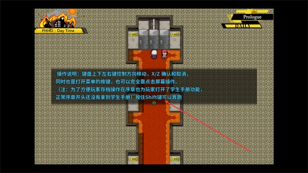 4、当前界面显示操作说明,用键盘上下左右键控移动,X/Z作确认取消,按住Shift可奔跑,也能点击屏幕操作。