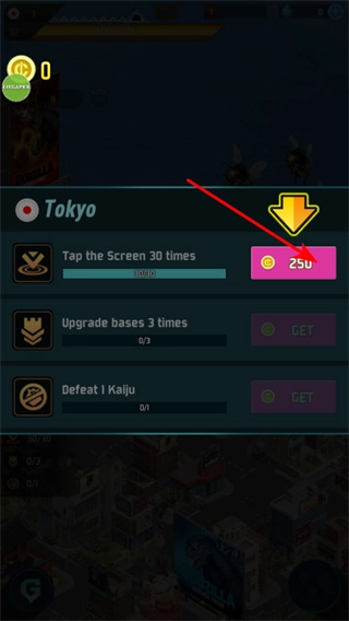 完成点击屏幕30次的任务后,点击奖励按钮领取任务奖励,可获取250金币,这些金币可积累起来用于后续建设。