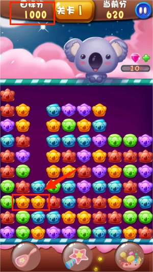 2、界面上方显示关卡目标分数,你需要通过连接相同颜色的小熊来完成消除操作。