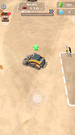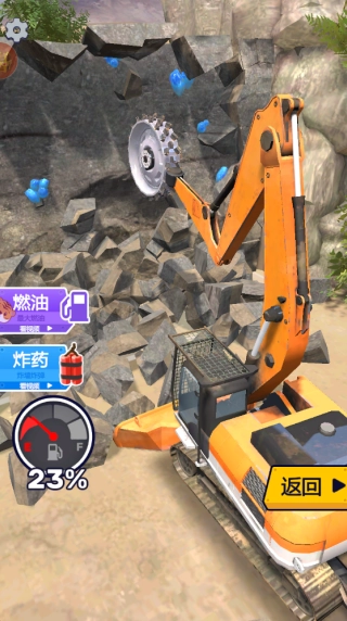 用获得的金币解锁下一台工程车,驾驶新车在矿场里铲挖石头,还能自由调整移动方向。