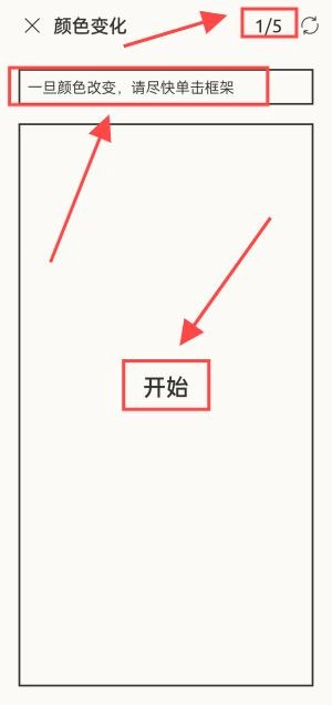 2、点击“开始”按钮,当颜色发生变化时,请尽快点击框架。总共包含五道题目。