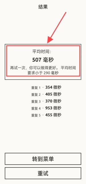 3、只要点击屏幕的平均时长低于290毫秒就能顺利过关。