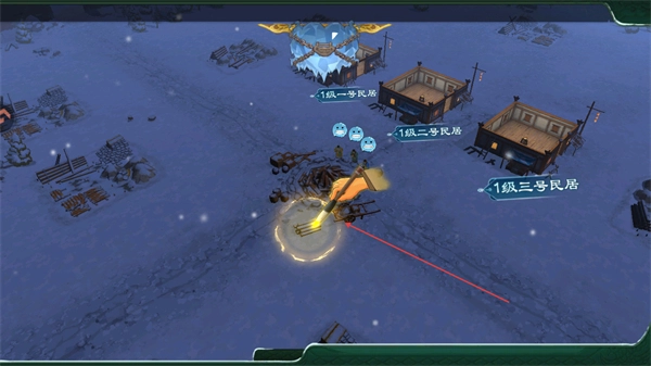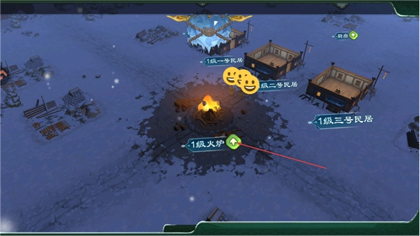 1、在场景里选定建造位置,修建1级的一号民居、二号民居和三号民居,搭建好基础建筑。