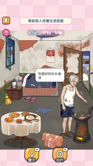 在第一关里,你可以通过把金币拖到那些破旧的家具上,来帮助老人一步步地把居住环境变得更好。