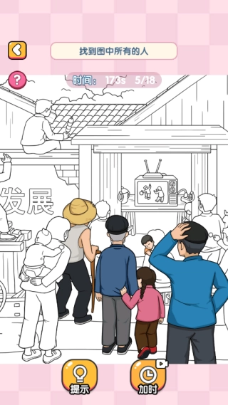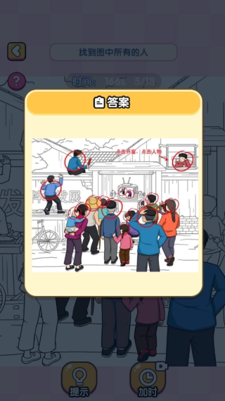 第二关要求在复杂的场景里找出所有隐藏的人物,点击对应的角色就能完成标记操作。