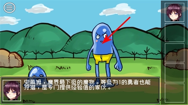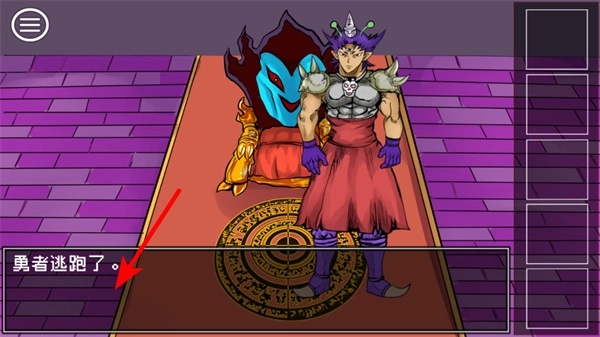 1、进入游戏剧情界面后,点击红色箭头所指的区域,推进“勇者逃跑了”相关的剧情流程,这是启动游戏操作的步骤。