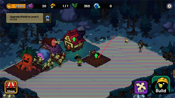 1、在该界面点击农田区域,可准备升级Field,同时可通过Shop、Build等按钮开展资源或建筑相关操作。