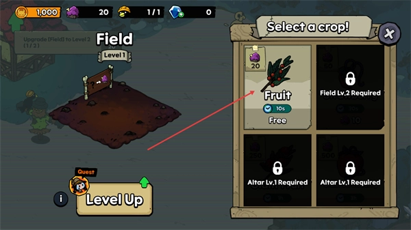 2、点击农田后弹出Selectacrop界面,选择Fruit作物进行种植,该作物消耗20资源且10秒即可成熟。