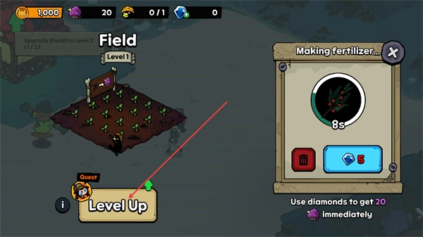 3、选择作物后进入Makingfertilizer流程,可等待8秒完成种植,也能用钻石加速,同时点击LevelUp推进升级任务。