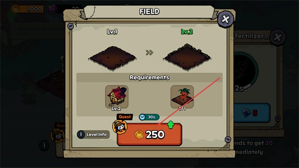 4、打开FIELD升级界面,满足Requirements中的条件后,消耗250资源即可将Field升级到2级。