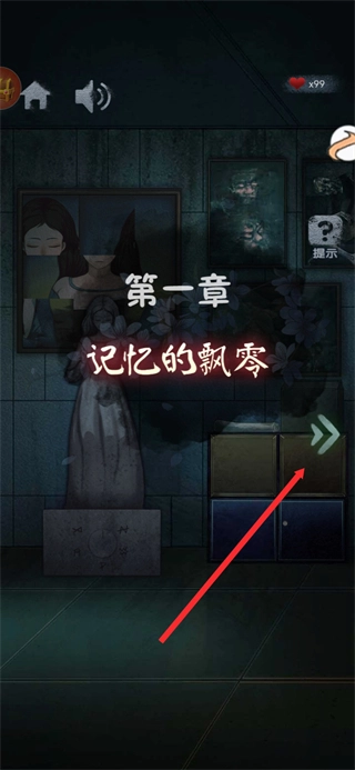 1、进入游戏章节界面后,点击右侧箭头按钮,开启第一章记忆的飘零的解谜流程,进入对应的场景探索环节。
