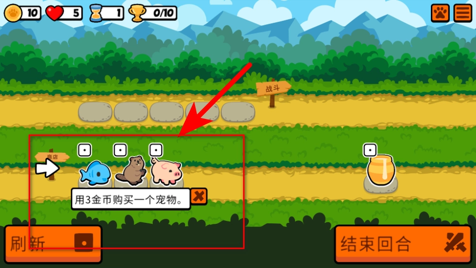 3、进入游戏对局后,在商店区域可以用3金币购买一个宠物,来组建自己的宠物队伍。