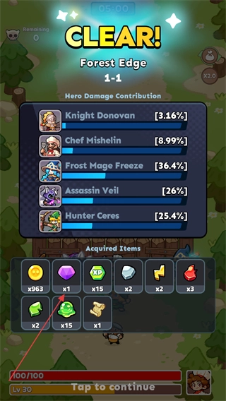 4、成功通过关卡后,点击界面上的继续按钮,就能领取上述各类奖励食材,随后返回游戏餐厅界面开展经营。